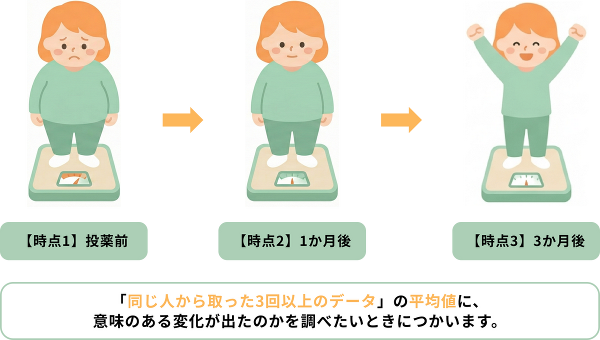 「対応がある」とは前述の通り、「同じ人(または物)から繰り返し測ったデータ」であることを指します(全く別の人を集めて比較する場合は「対応がない」データとなります)。「わざわざ同じ人を何度も測らなくても、毎回別の人を集めて測ればいいのでは?」と思うかもしれませんが、同じ人を反復して測定することには個人差というノイズを取り除けるメリットがあります。人間の体重には、元から大きな個人差があります(最初から50kgの人もいれば、100kgの人もいます)。もし毎回違う人を集めてしまうと、「体重が減ったのは、薬の効果なのか、それとも元々体重が軽い人を集めてしまっただけなのか」が区別しにくくなります。しかし、同じ人を追いかければ「Aさんはマイナス2kg」「Bさんはマイナス3kg」という純粋な変化量だけにフォーカスできるため、少ないデータ数でもより正確に効果(差)を検出しやすくなります。 - 3つ以上のグループ(時点)であること: