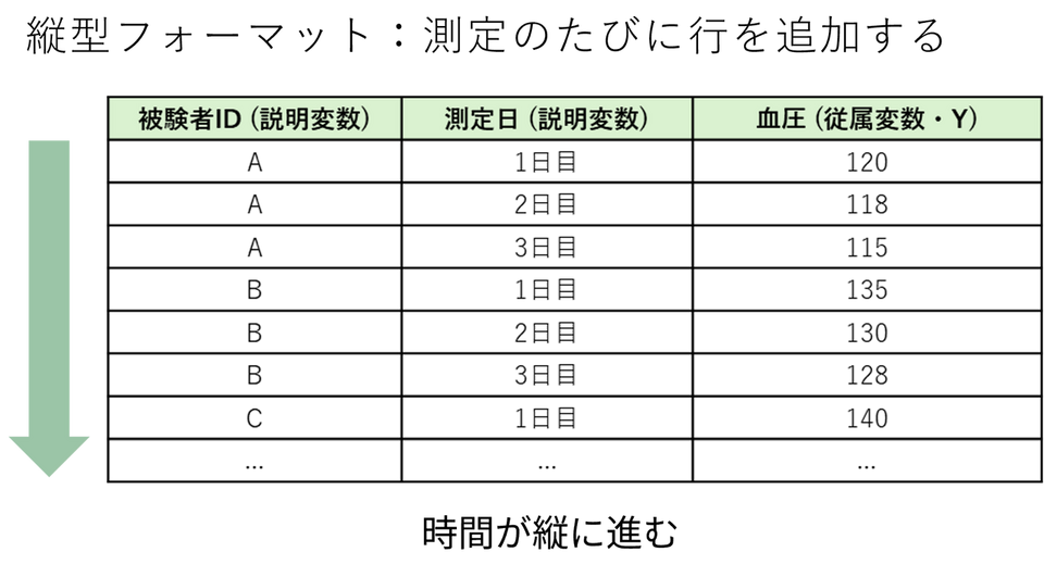 例)3人の患者(A、B、C)に、ある薬を投与し、血圧を3日間(1日目、2日目、3日目)測定した場合のデータ形式