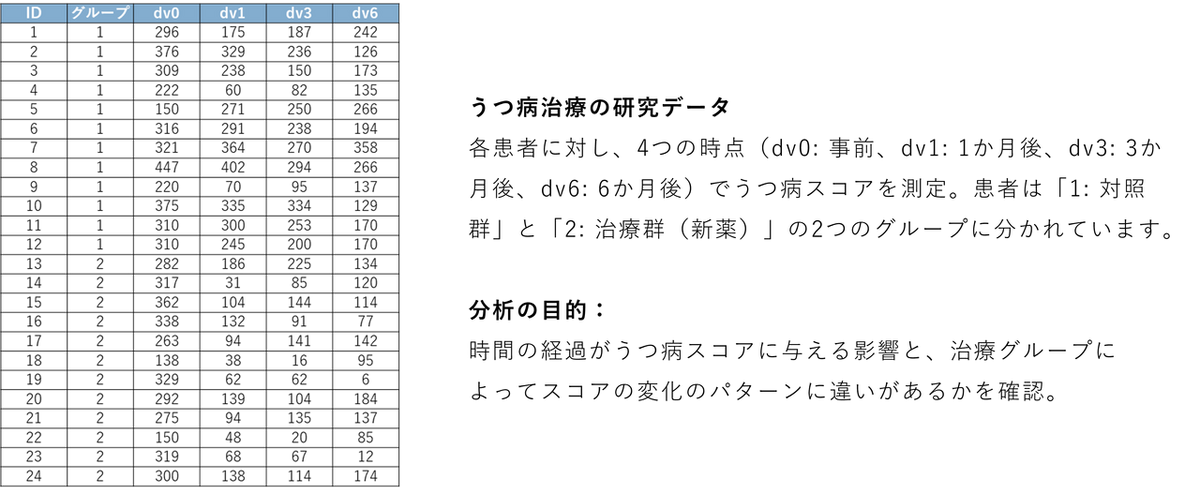 今回は、うつ病治療の研究データ(横型フォーマット)を使用します。このデータでは患者(24名)に対し、4つの時点(dv0:治療前、dv1:1か月後、dv3:3か月後、dv6:6か月後)でうつ病スコアを測定しています。また、患者は「1:対照群」と「2:新薬群」の2つのグループに分かれています。