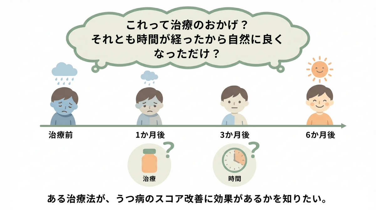実験前はどちらのグループも同じうつ病レベル(差がない状態)でしたが、新薬を投与したグループは、対照群と比べて1か月後から明らかに早く、スコアが改善する推移をたどっています。