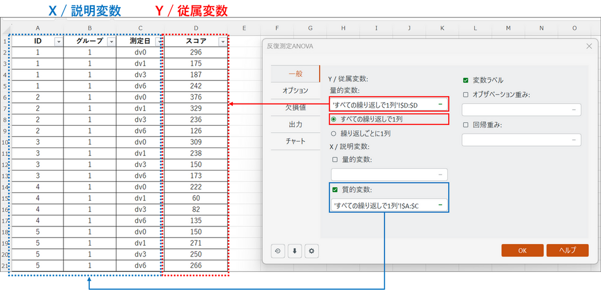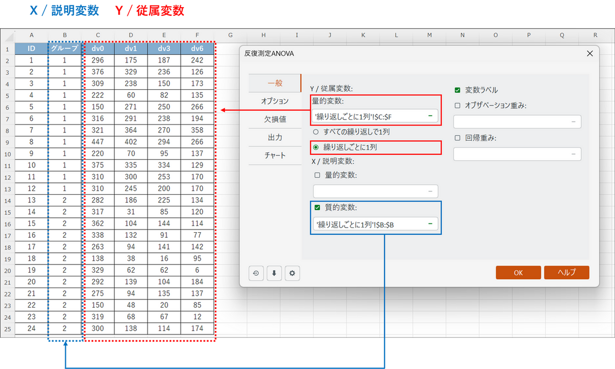 測定したデータ(従属変数)がすべて1つの列に縦に長く入力されている形式の場合は、データ形式は [すべての繰り返しで一列] を選択し、従属変数と説明変数は以下のように入力します。