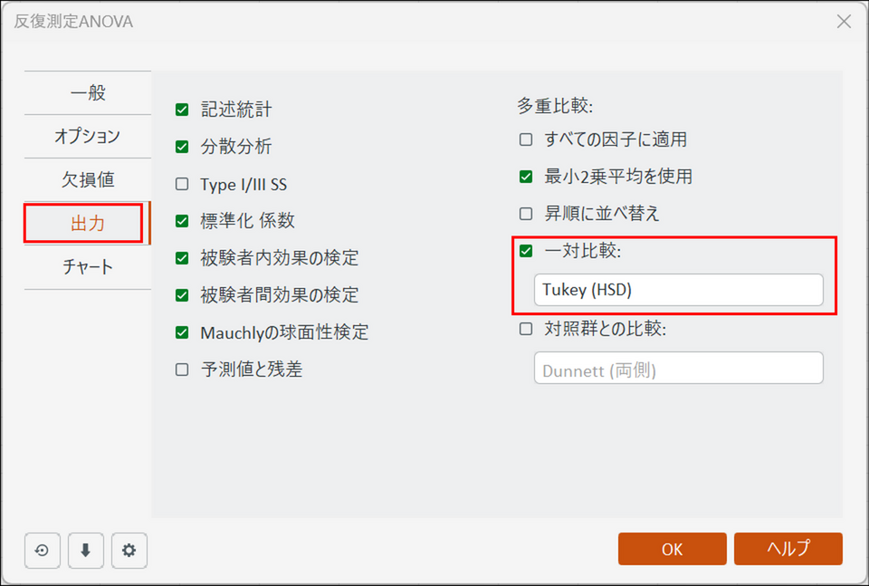 [一対比較] にチェックを入れることで、分散分析で「有意差あり」となった後、「具体的にどのグループ間に差があるのか」を検証することができます。今回は最も一般的に使われる「Tukey (HSD)」を選択しておきます。 -