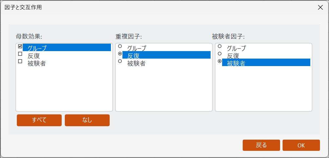 因子と交互作用のダイアログボックスが表示されます。画面内にある3つのボックスに因子を以下のように割り当てます。