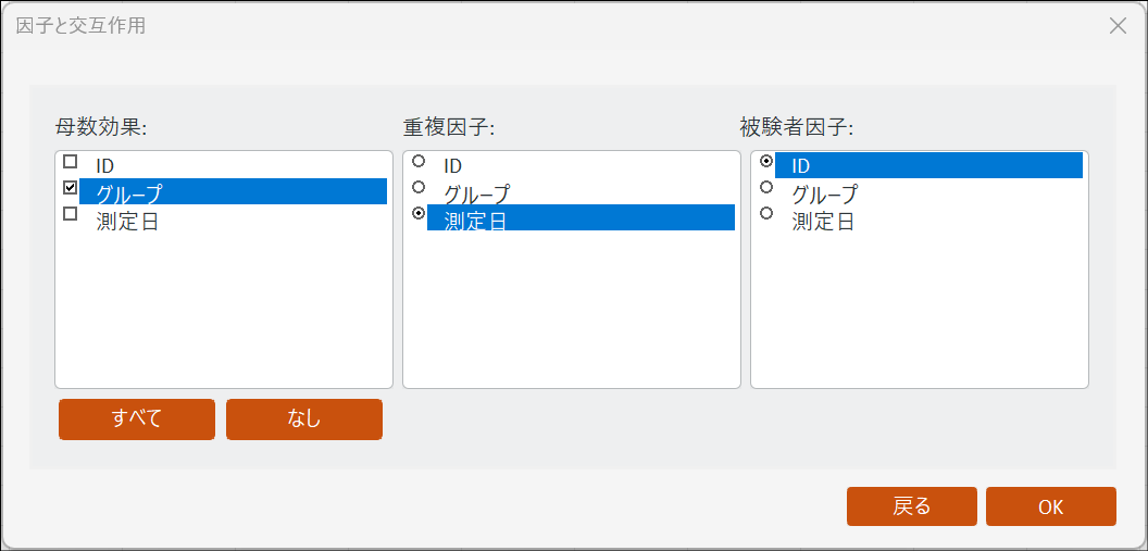 縦型フォーマットのデータで実行する場合は、「母数効果」にグループ、「重複因子」に測定日、「被験者因子」にID の列を選択する必要があります。