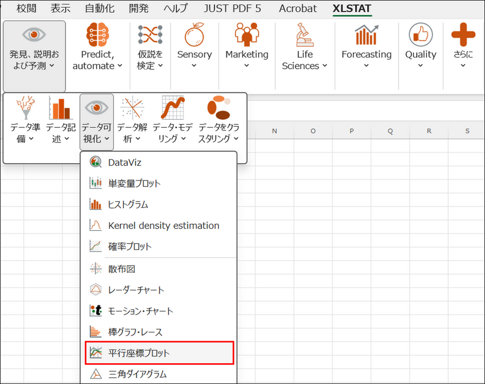 XLSTAT のメニューから[発見、説明および予測] > [データ可視化] > [平行座標プロット] を選択して起動します。