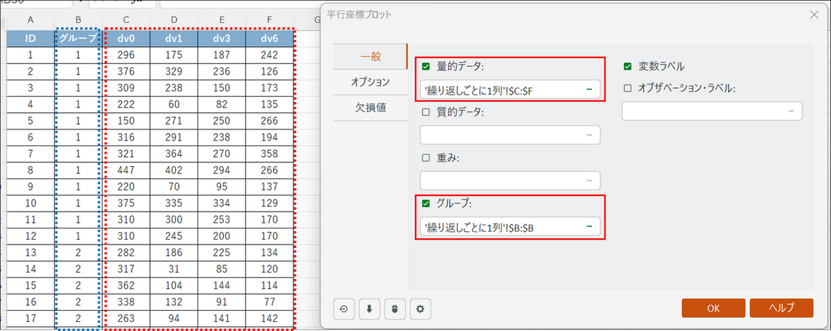 - 量的データ:時間経過のスコアが入った列(dv0〜dv6)を選択します。