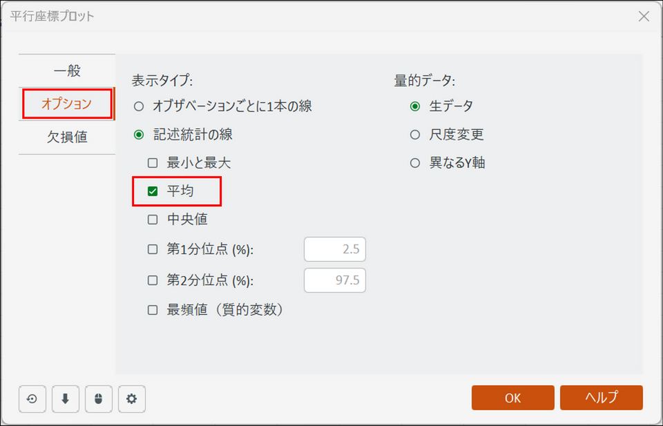 [オプション] タブに切り替え、[平均] にチェックを入れます。