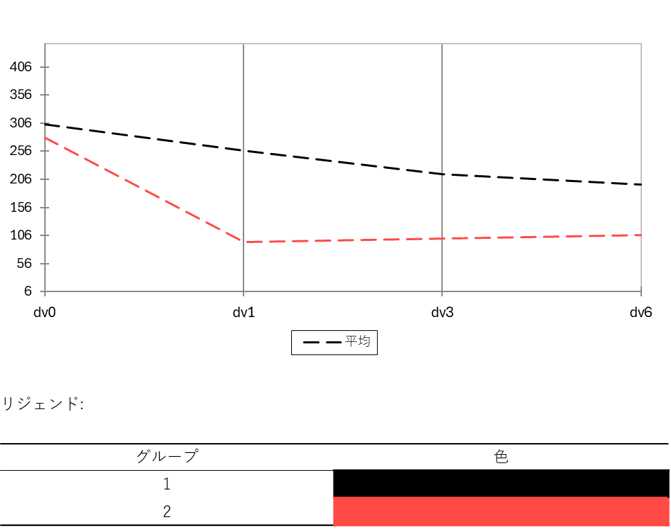 「OK」をクリックすると、別シートにグループごと(対照群と新薬群など)に色分けされた折れ線の軌跡が描画されます。多重比較検定の表と照らし合わせながら見ることで、どこで差が開き始めたのかを直感的に理解することができます。