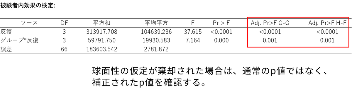 反復測定分散分析において、最も重要な検定結果です。「反復(時間の経過)」と「グループ*反復(グループによる変化パターンの違い=交互作用)」の効果を確認します。ここで、球面性検定の結果が非常に重要になります。今回は球面性の検定で球面性が棄却されている(p < 0.05)ことが判明しているため、通常の Pr > F の列ではなく、表の右側にある補正されたp値「Adj. Pr>F G-G(Greenhouse-Geisser 補正)」 または「Adj. Pr>F H-F(Huynt-Feldt 補正)」の数値を確認します。