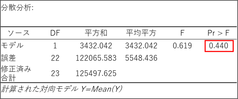 以下のようにp値が0.05 より大きいか小さいかで、この後に見るべき項目が変わります。