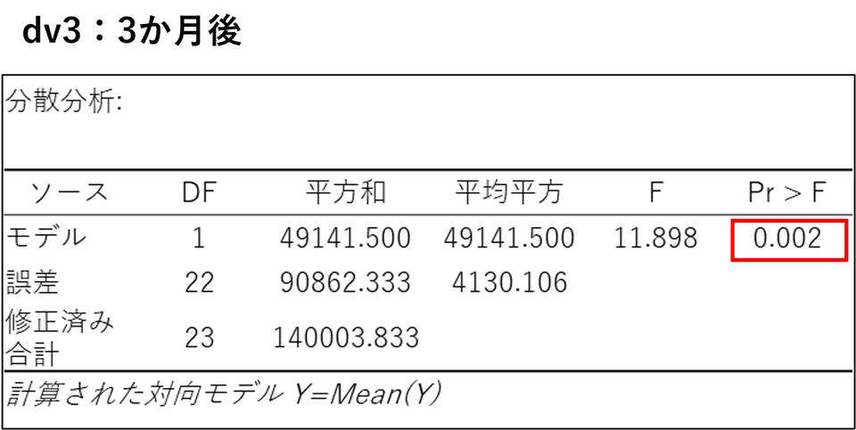 dv0(治療前)の分散分析表ではp値が「0.440」となっており、0.05(有意水準)より大きくなっています。これは、「実験を始める前の段階では、2つのグループのうつ病スコアに統計的な差はなかった(=公平なスタートラインに立っていた)」という前提を証明しています。