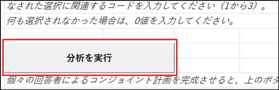 上記表へのデータ入力が完了したら、選択型コンジョイント分析を実行してみましょう。
