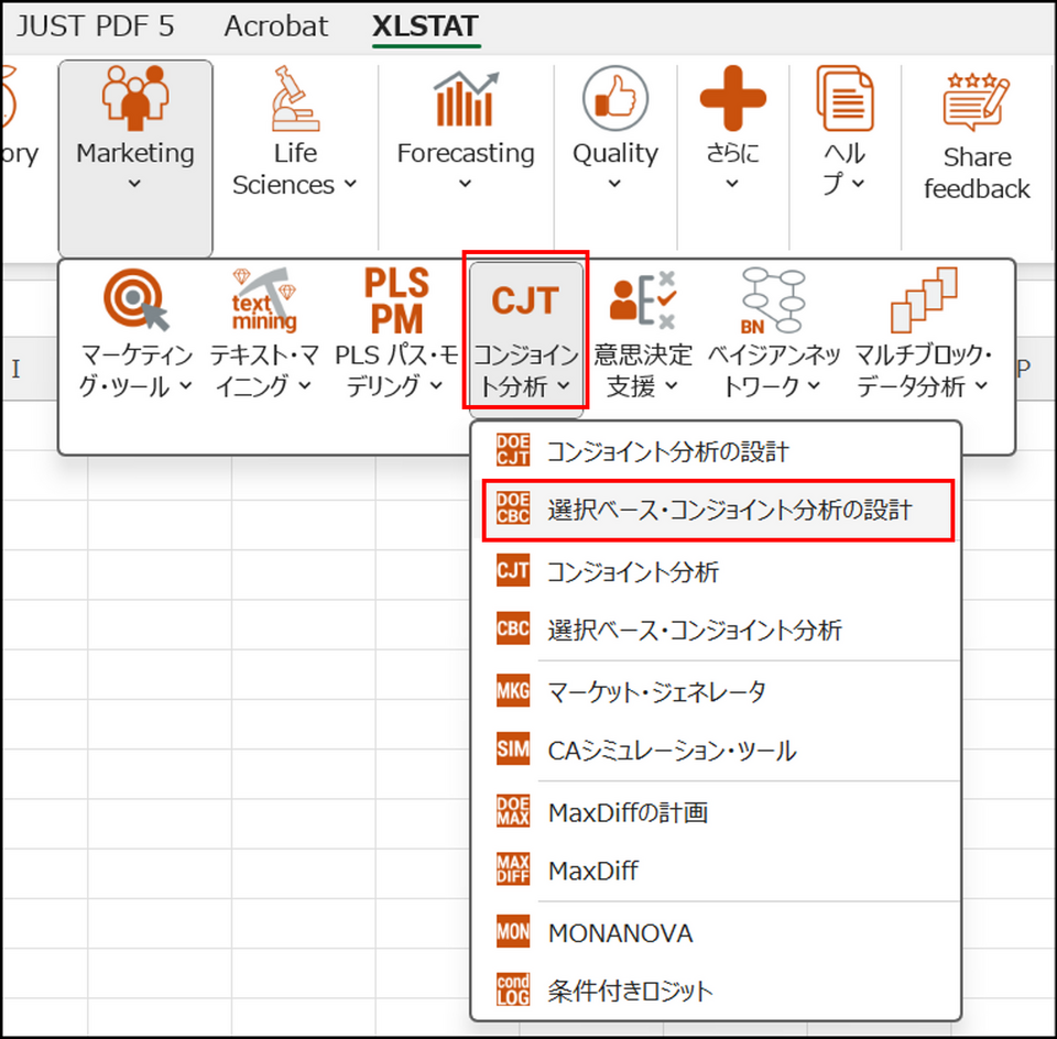 XLSTAT を起動し、[コンジョイント分析] > [選択ベース・コンジョイント分析の設計] を選択します。