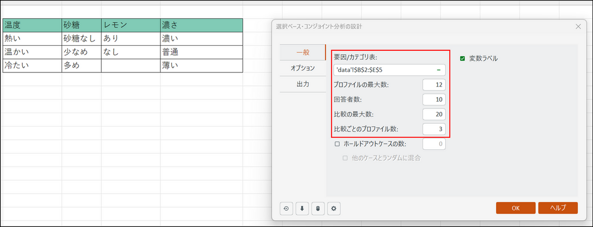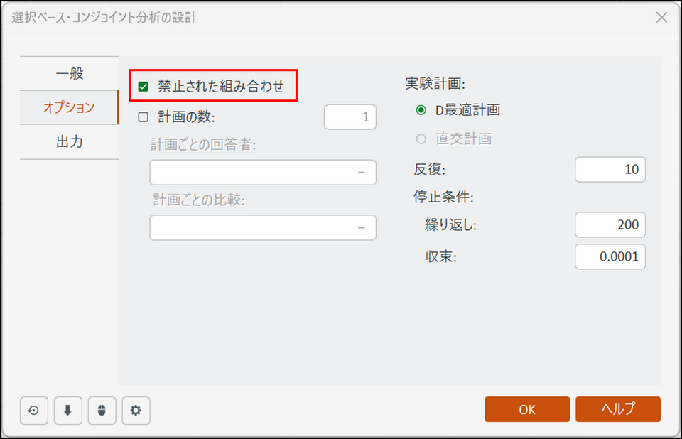 [オプション] タブでは、[禁止された組み合わせ] 項目にチェックを入れることで、プロファイルで禁止する組み合わせを指定することができます。これは組み合わせとして矛盾するような要因間の水準同士が同時に提示されるのを防ぐ機能です。今回の事例ではレモンが「なし」で、濃さが「濃い」という要因の組み合わせを提示するプロファイルからあらかじめ除外しておきます。