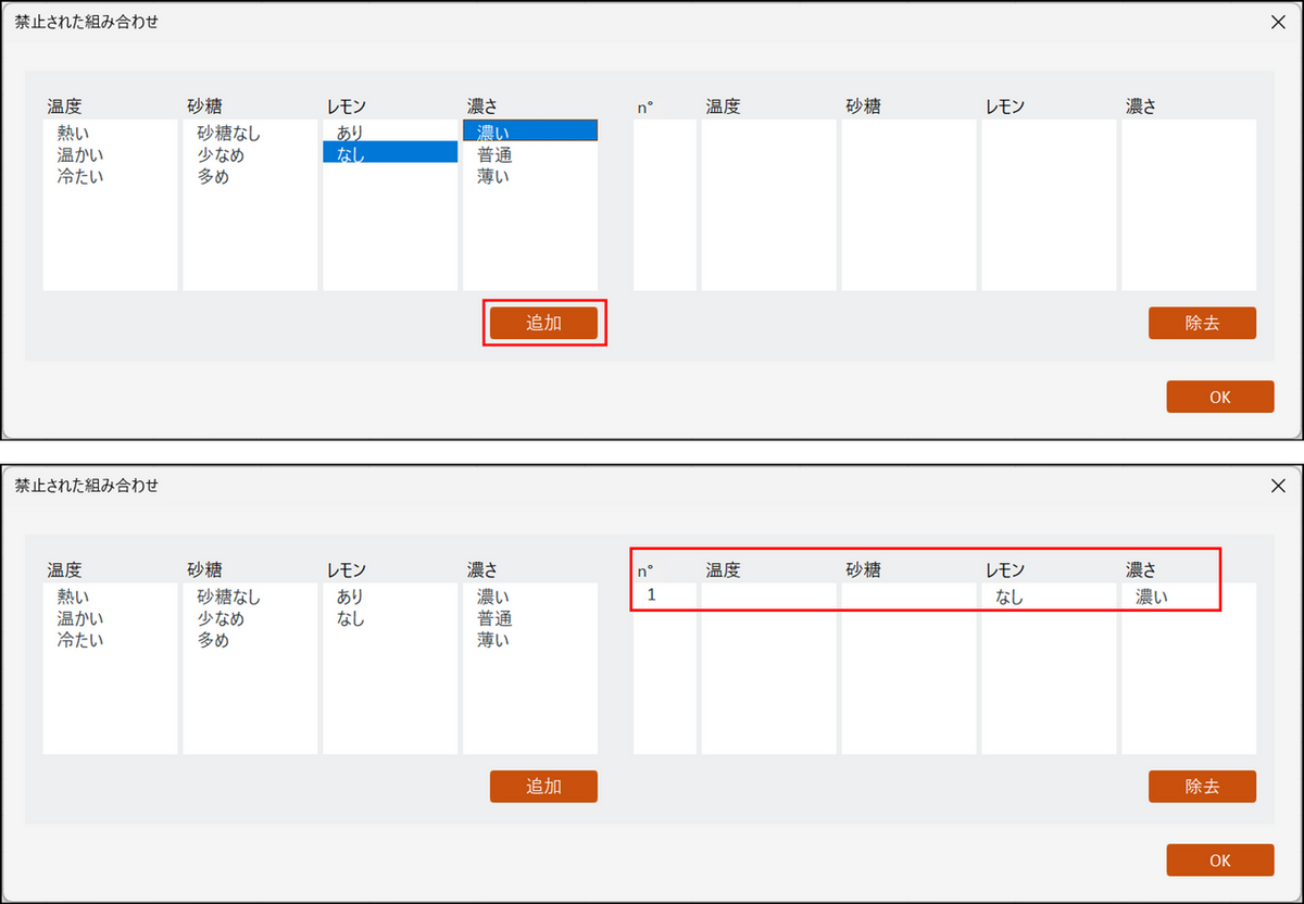 [OK] をクリックすると、禁止する組み合わせを指定する画面が表示されます。画面左側から禁止する組み合わせ(レモン:なし、濃さ:濃い)を選択し、[追加] ボタンをクリックすると、画面右側に禁止する組み合わせが追加されます。