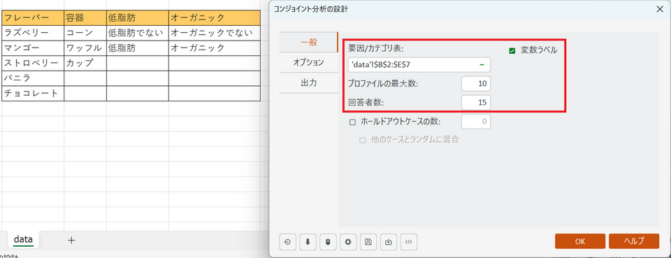 要素のデータを選択します。データの選択は [要因/カテゴリ表] の入力欄をクリックし、その後でエクセル上のデータを直接指定することで可能です。 - [プロファイルの最大数]: