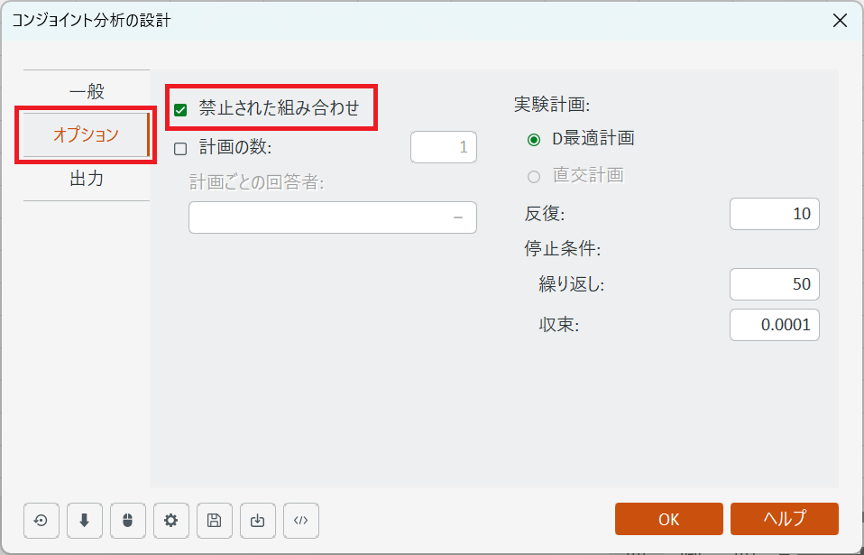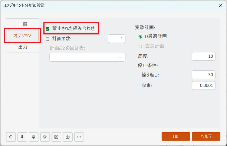 [オプション] タブでは、[禁止された組み合わせ] 項目にチェックを入れることで、プロファイルで禁止する組み合わせを指定することができます。これは組み合わせとして矛盾するような要因間の水準同士が同時に提示されるのを防ぐ機能です。今回の事例ではフレーバーが「チョコレート」で、「低脂肪」という要因の組み合わせを提示するプロファイルからあらかじめ除外しておきます。