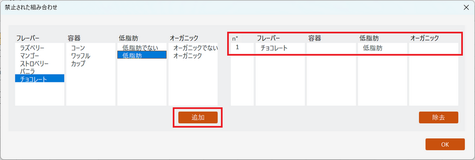 [OK] や [続ける] をクリックしていくと、禁止する組み合わせを指定する画面が表示されます。画面左側から禁止する組み合わせ(フレーバー:チョコレート、低脂肪:低脂肪)を選択し、[追加] ボタンをクリックすると、画面右側に禁止する組み合わせが追加されます。