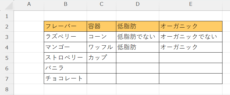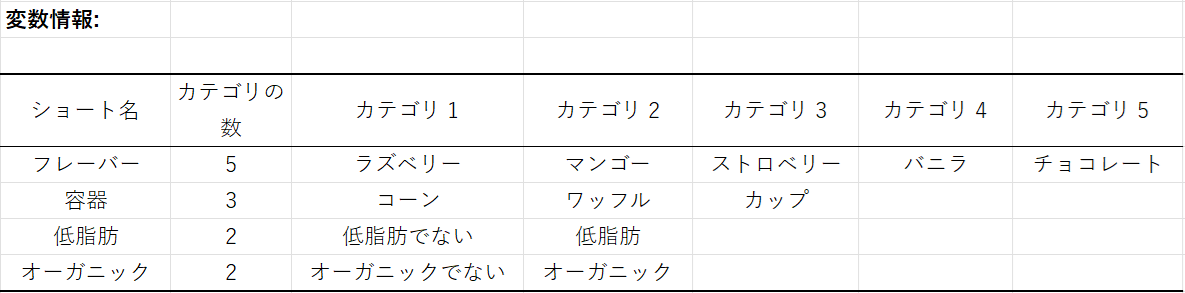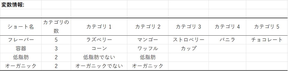 ※こちらの表は出力する度に内容が変わります。調査した結果は以下のようになりました。例えば、回答者1であればフレーバーが「ラズベリー」、容器は「カップ」、低脂肪かどうかは「低脂肪でない」、オーガニックかどうかは「オーガニックでない」アイスクリームを1番に選んだことになります。