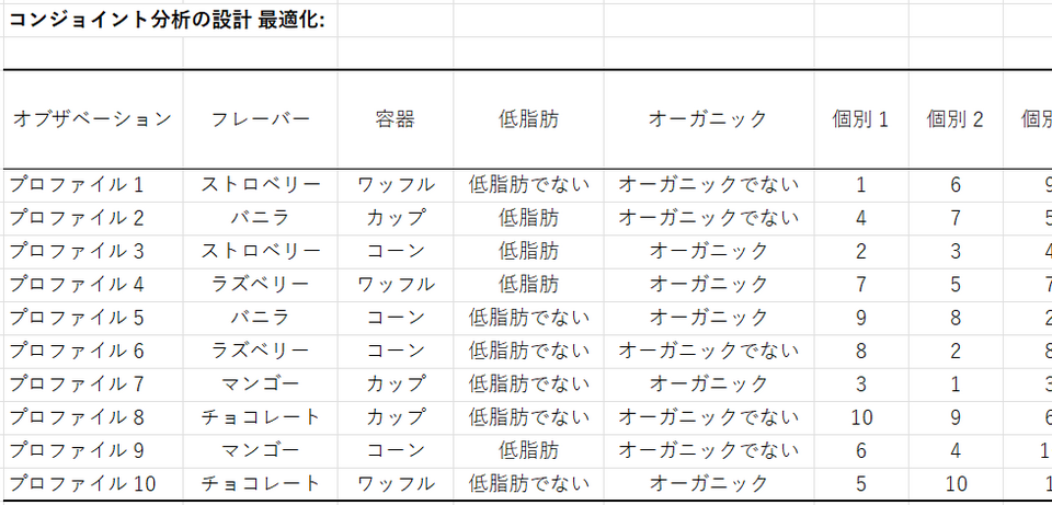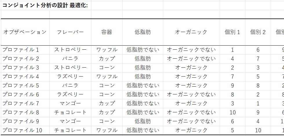 3番目の表(コンジョイント分析の設計 最適化)は、実験計画法を用いて作成されたプロファイルです。今回の事例ではプロファイルが10個作成されましたので、15名の回答者にこのプロファイルを提示し、1〜10の順位を付けてもらいます。すべての回答が集まったら、各回答者の順位をこの表に入力していきます。
