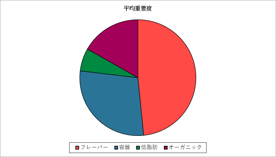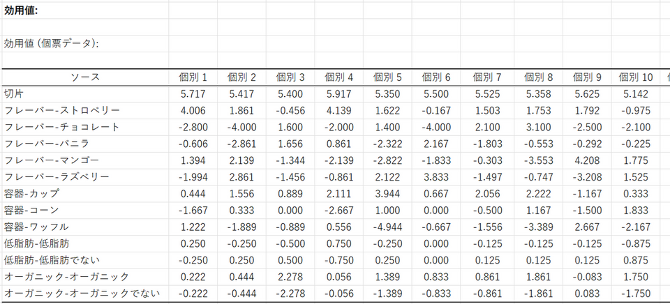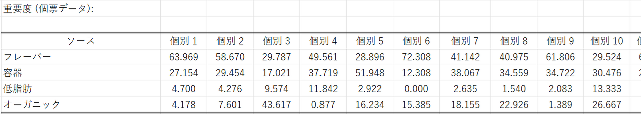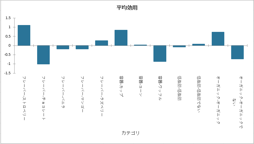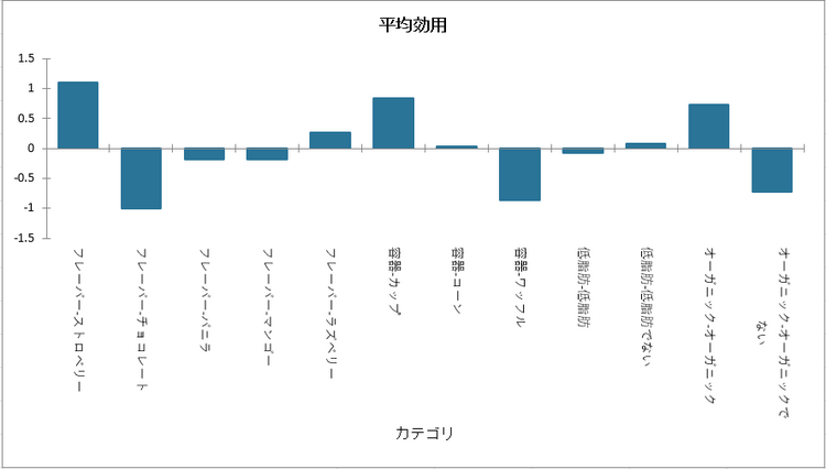 今回の事例では、個人レベルでも平均レベルでも、フレーバーと容器が最も重要な要因であると判断することができます。より具体的には、ストロベリーやラズベリーのフレーバーとカップの容器が大きくプラスに働いています(平均効用グラフ)。したがって上記のような特徴を持つアイスクリームを開発することで、消費者の満足度を高めることができると考えられます。