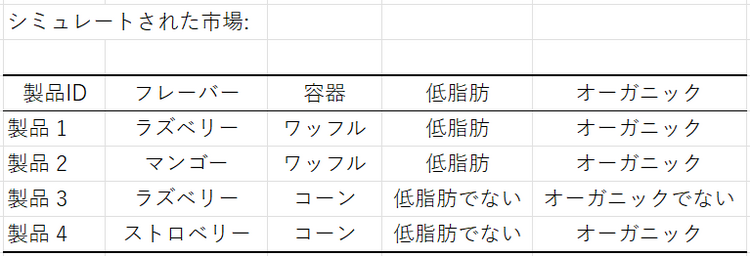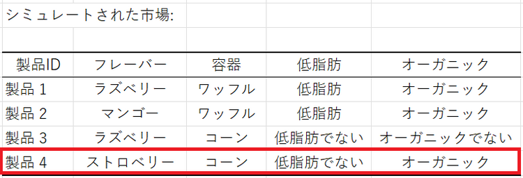 コンジョイント分析の主な利点は、市場にある製品が個人ごとにテストされていなくても、市場をシミュレートできることです。下記の事例ではアイスクリーム市場を分析し、新製品(製品4)のインパクトと市場シェアを知りたいと考えています。この製品はオーガニックのストロベリーアイスクリームで、低脂肪ではなく、コーンで提供されます。現在の市場には、異なる特徴を持つアイスクリームが3つあることが分かっています。下記の表は、シミュレーションされた市場を示しています。