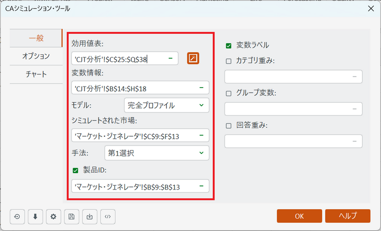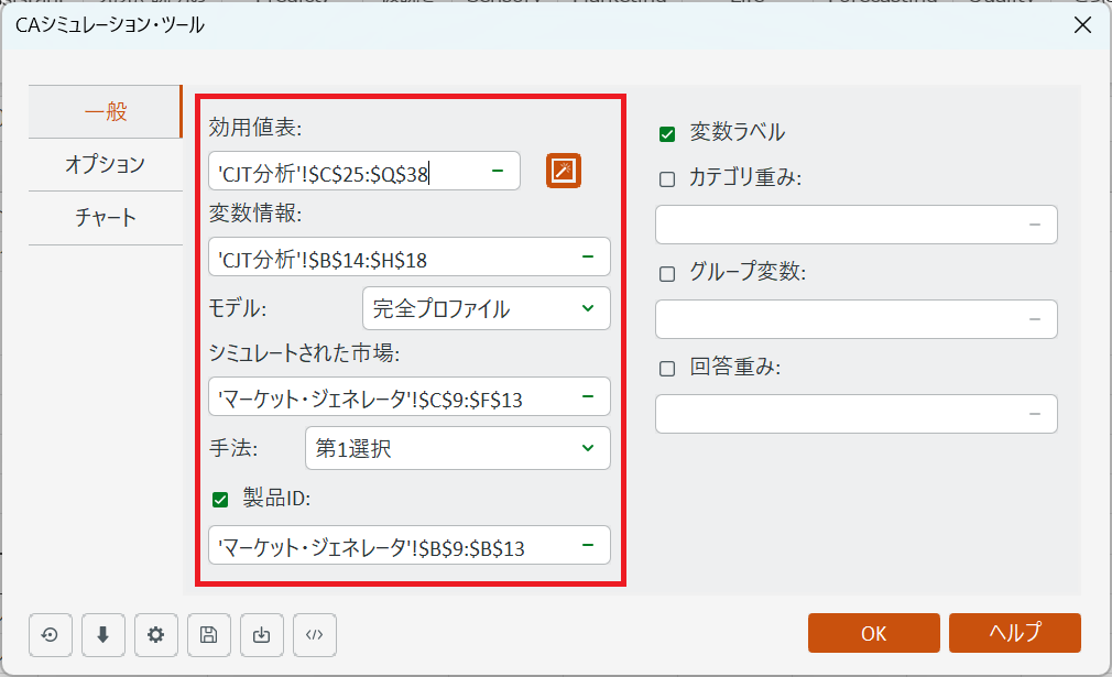 1つ目の項目で、コンジョイント分析の結果が表示されているシート(CJT分析)の最初のセル(A1)を選択します。