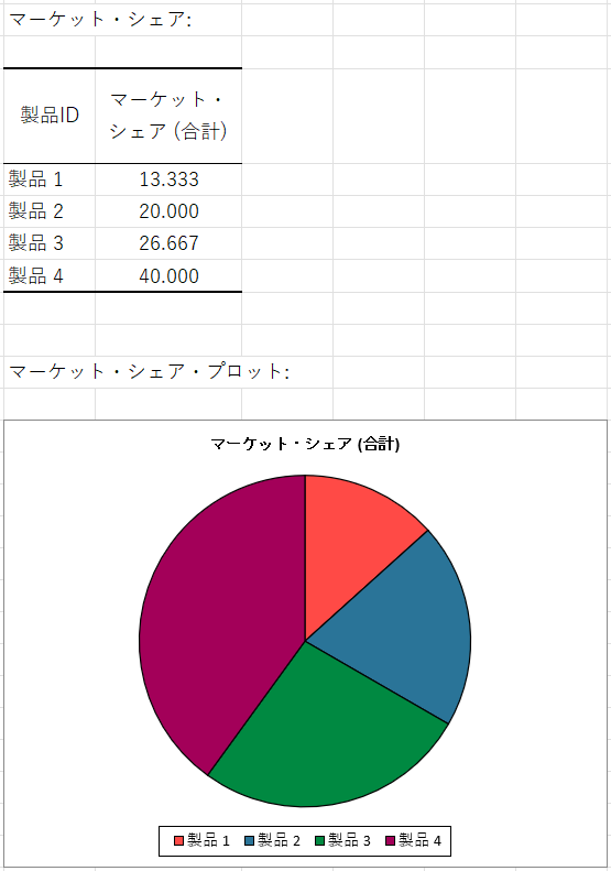 以下の表は、新製品(Product 4)の市場シェアが40.00%であることを示しています。この結果は、この製品を市場投入するのに十分なものと思われます。