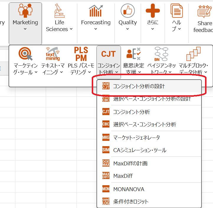 XLSTAT を起動し、[Marketing] > [コンジョイント分析] > [コンジョイント分析の設計] を選択します。