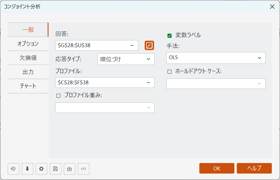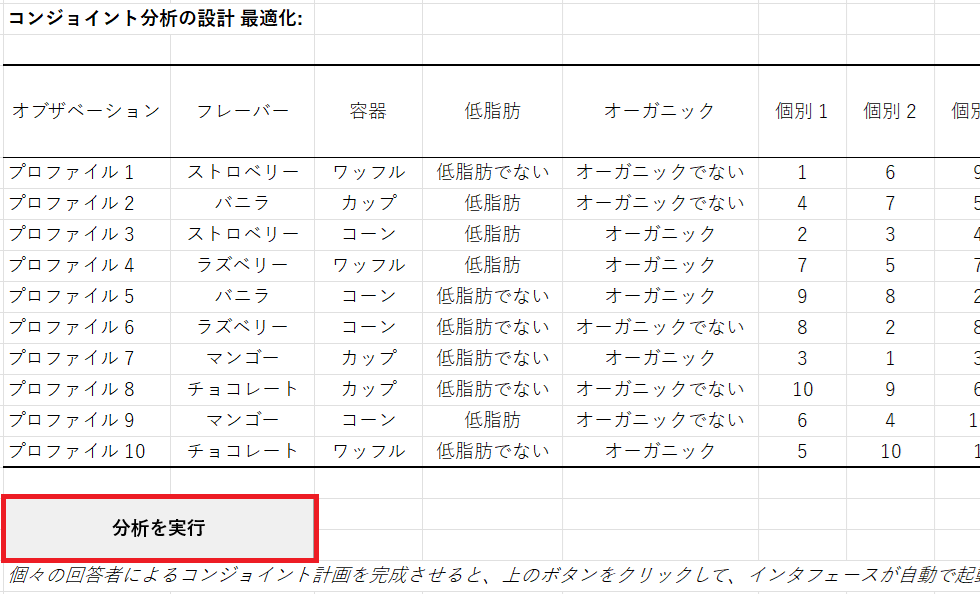 上記表へのデータ入力が完了したら、コンジョイント分析を実行してみましょう。