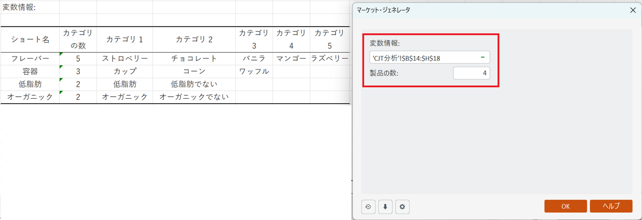 [変数情報] 欄で製品の要因表を選択します。入力欄をクリックし、[CJT分析] シートに表示された [変数情報] の表を選択します。