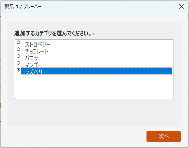 - フレーバー(ラズベリー、マンゴー、ストロベリー、バニラ、チョコレート)