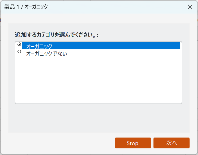 1つ目の製品定義が完了したら、[次へ] をクリックし、同様の手順で2つ目以降の製品を定義していきます。通常、市場に導入したい新製品は最後にするため、今回は製品4で新製品の要素を指定します。4つの製品定義が完了したら、[Stop] をクリックし、表の作成を終了します。作成された表は以下の通りです。