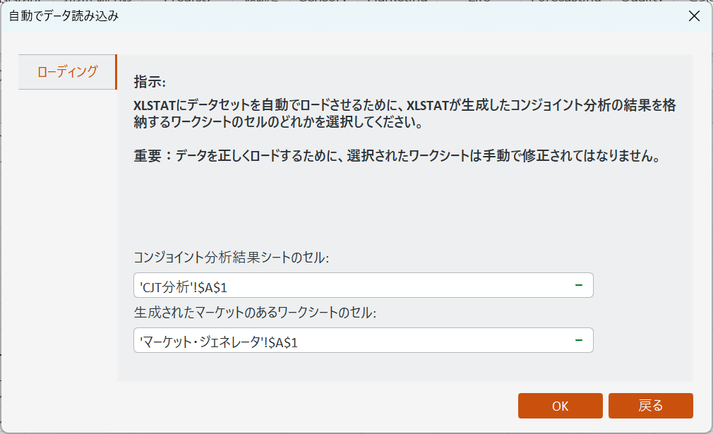 これらのデータを手動ですべて選択するのは大変なため、Utilities table 入力欄右側の「魔法の杖」のアイコンをクリックしましょう。コンジョイント分析とシミュレーションされた市場が XLSTAT で作成されている場合、4つのデータセットを自動で読み込むことができます。