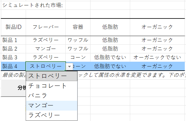 この例では、フレーバーをマンゴーに変更したことによって市場シェアが減少していることがわかります(33.33% → 27%)。したがって、新製品にはストロベリーのフレーバーを含める方がよいでしょう。