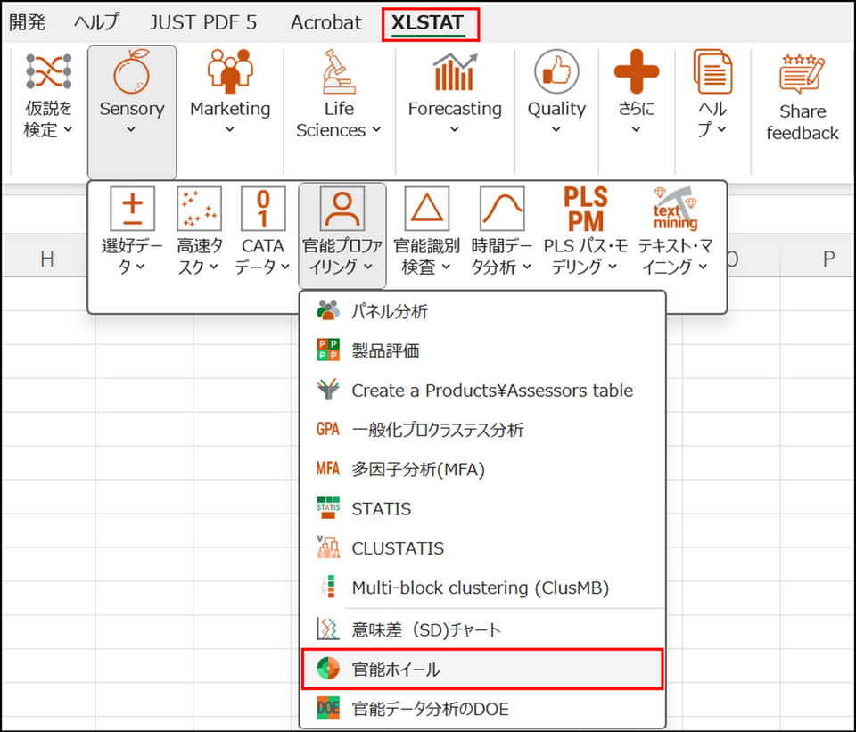 XLSTAT を起動し、[Sensory] > [官能プロファイリング] > [官能ホイール] を選択