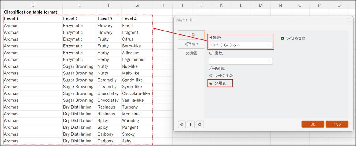 今回は分類表形式でフレーバーホイールを作成する方法をご紹介します。