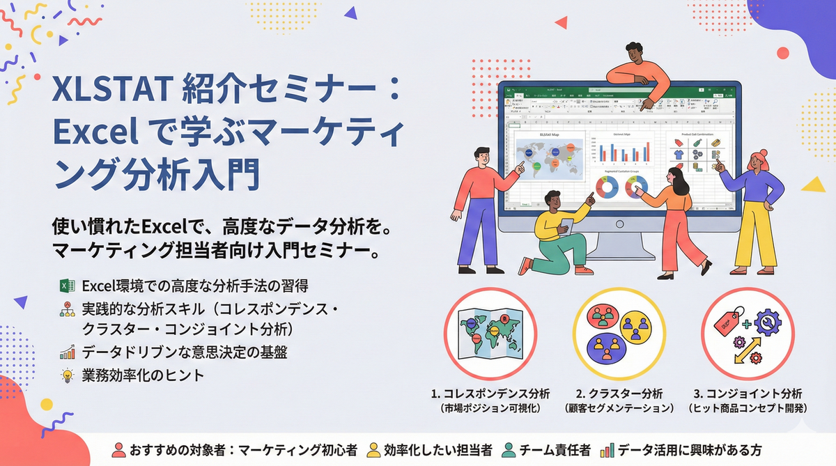 本セミナーでは、Excel アドオン型データ分析・統計ソフト「XLSTAT」を活用し、使い慣れたExcel の操作感のまま、顧客のセグメンテーションや新商品のコンセプト開発といった、ビジネスの意思決定につながる高度なデータ分析を誰でも簡単に行う方法をお伝えします。