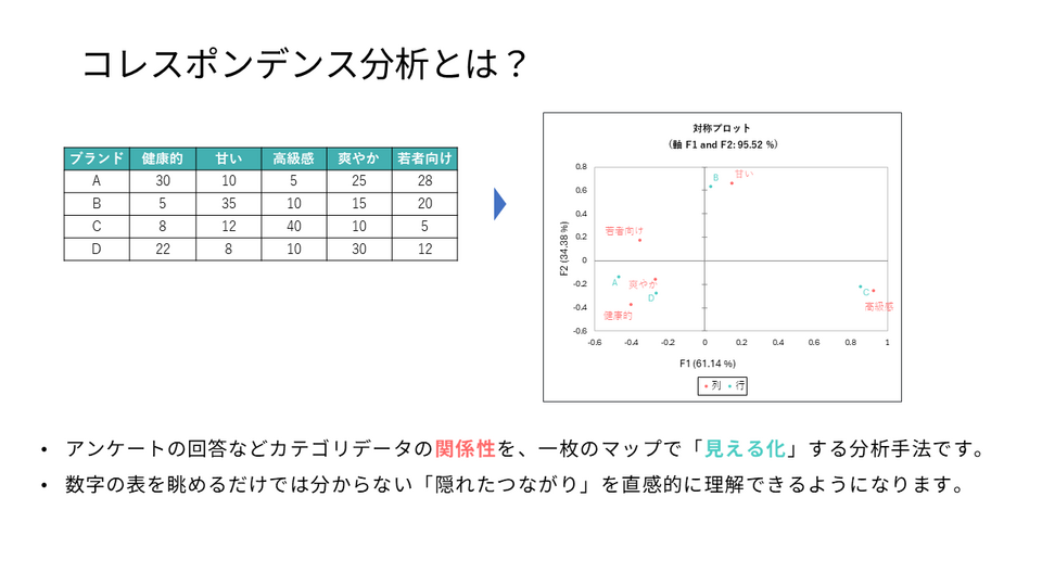 ・アンケート結果から、競合製品との立ち位置やブランドイメージをマップで直感的に把握します。