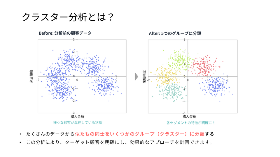 ・購買データなどから顧客を自動でグループ分けし、ターゲットとなる顧客層の特徴を把握します。